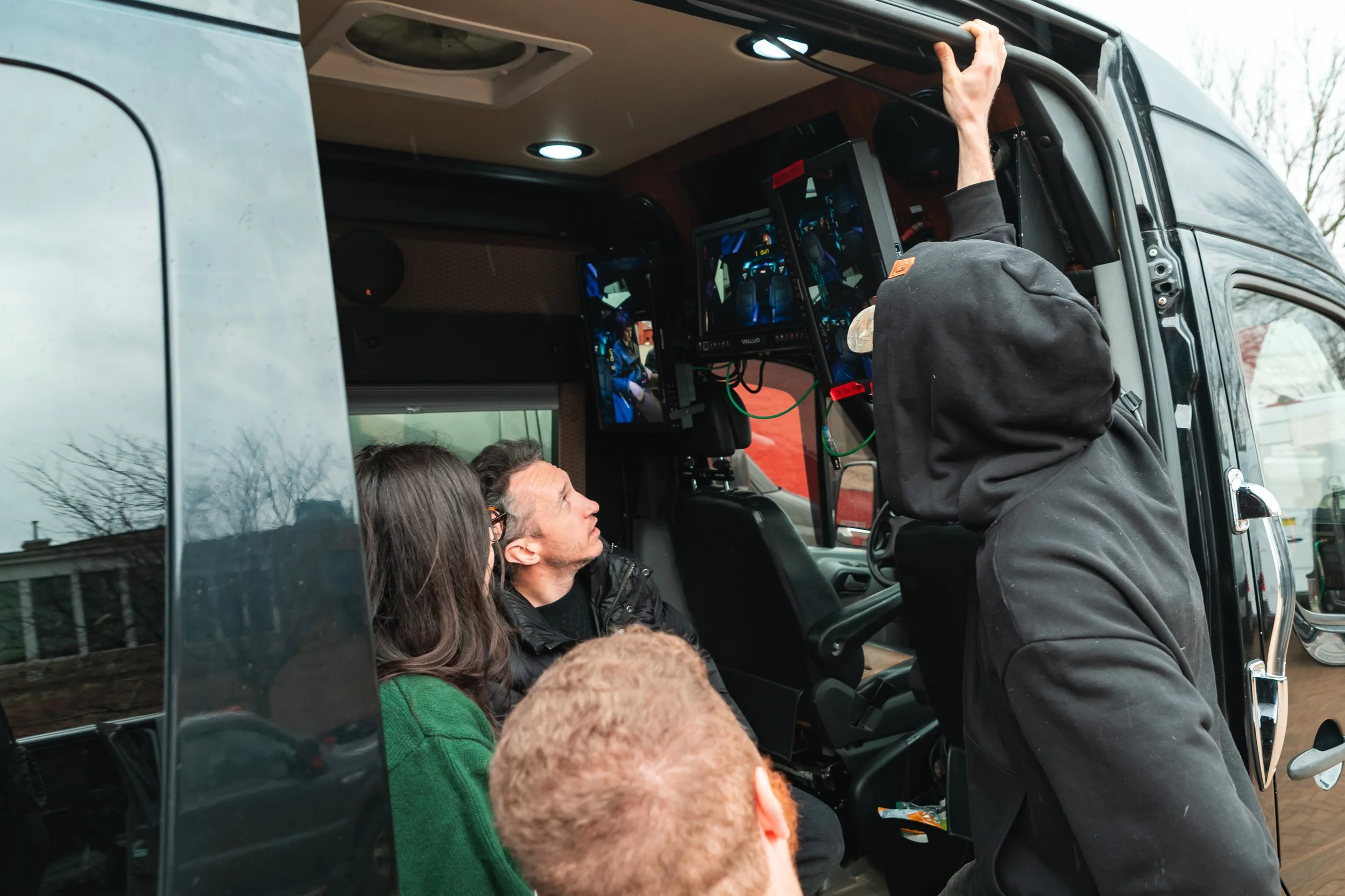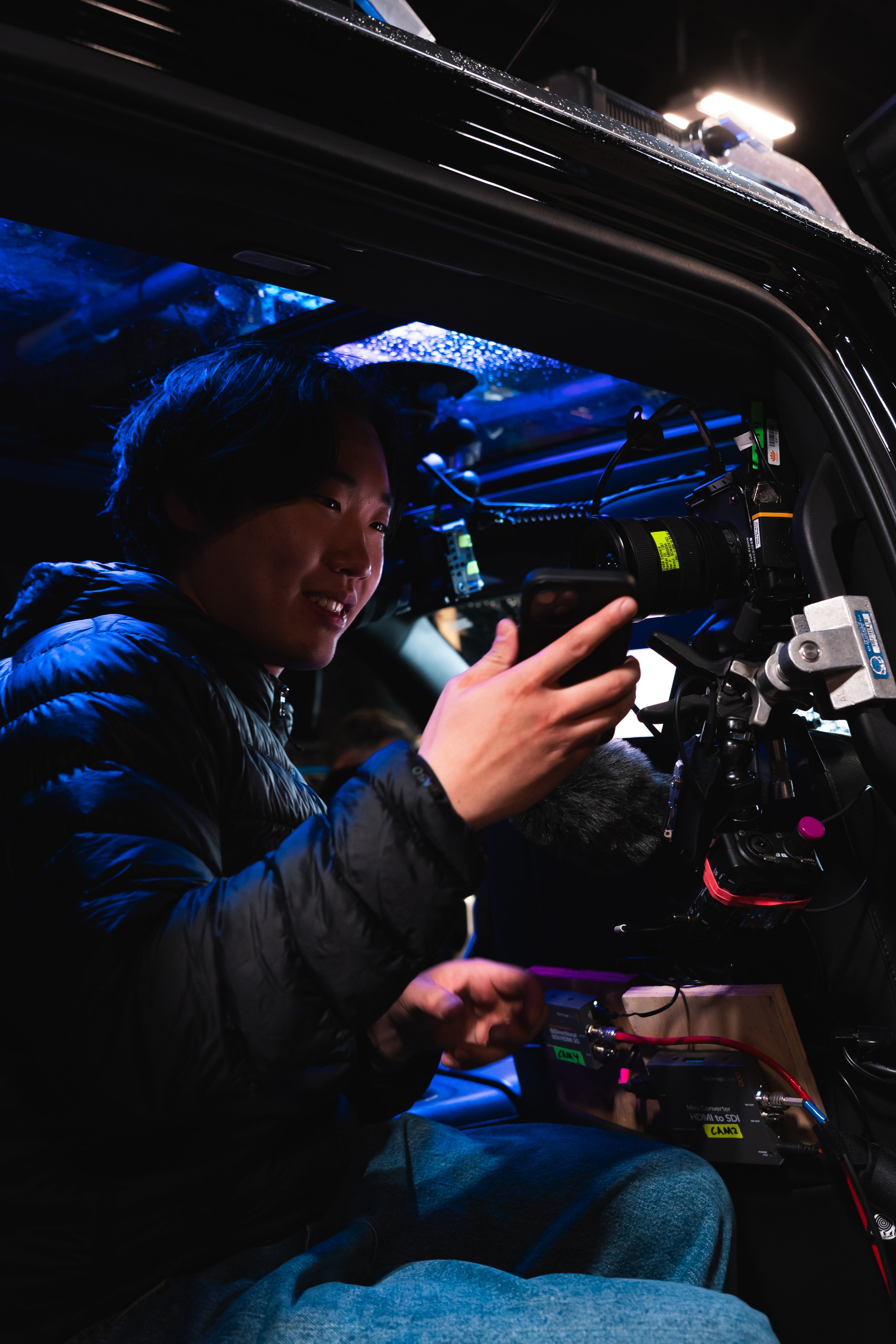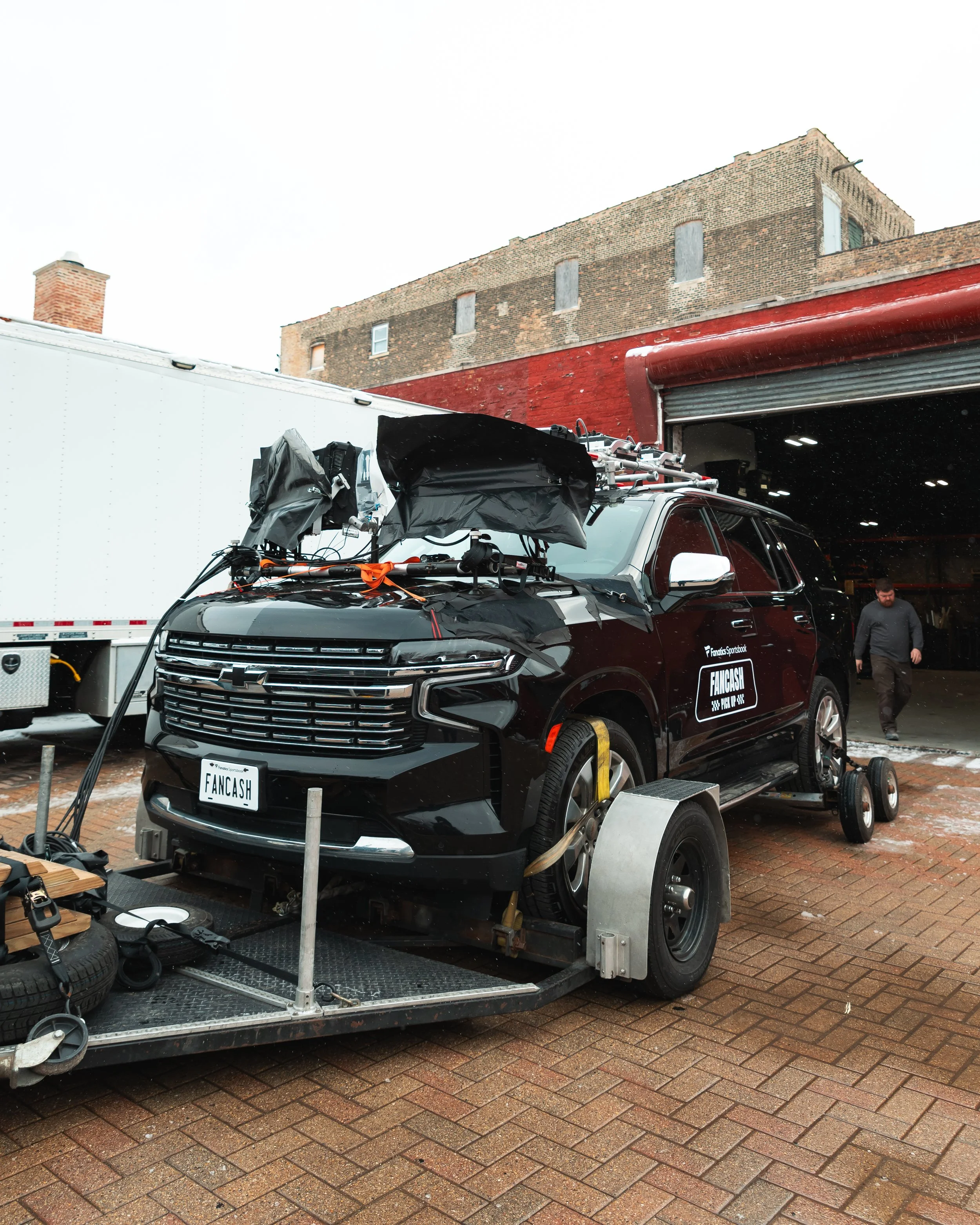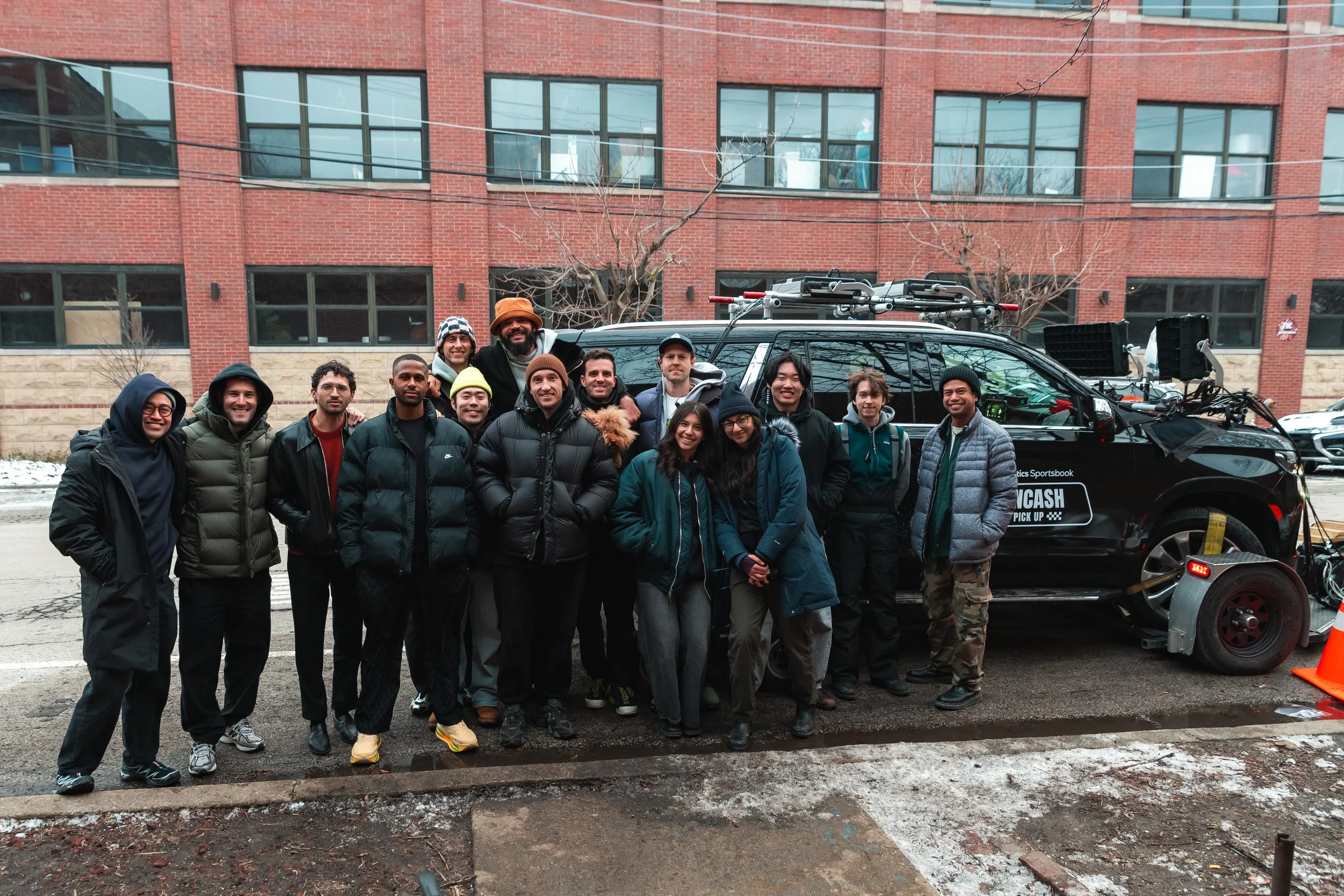 All we had to do was rig seven cameras, suction seal lights to the top of a picture car towed by a larger camera truck, connect transmission to a passenger van, organize two police escorts, and shoot seven groups in four hours in a 14 degree snow storm with 40mph winds.